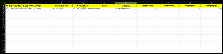 You can update fields such as SmartHub SKU, Product Name, Brand, Category, Dimensions (Length, Width, Height) and Image URL.