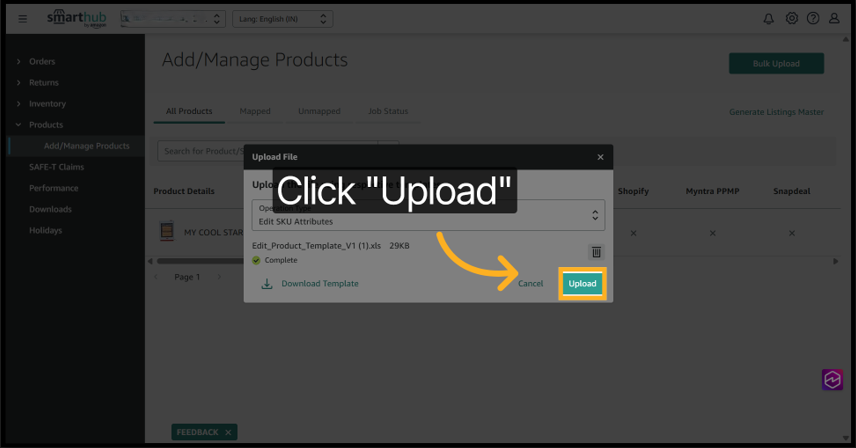 10. Navigate to Click to Upload and select the file. Now click on Upload to submit the edited SKU attributes file for processing.