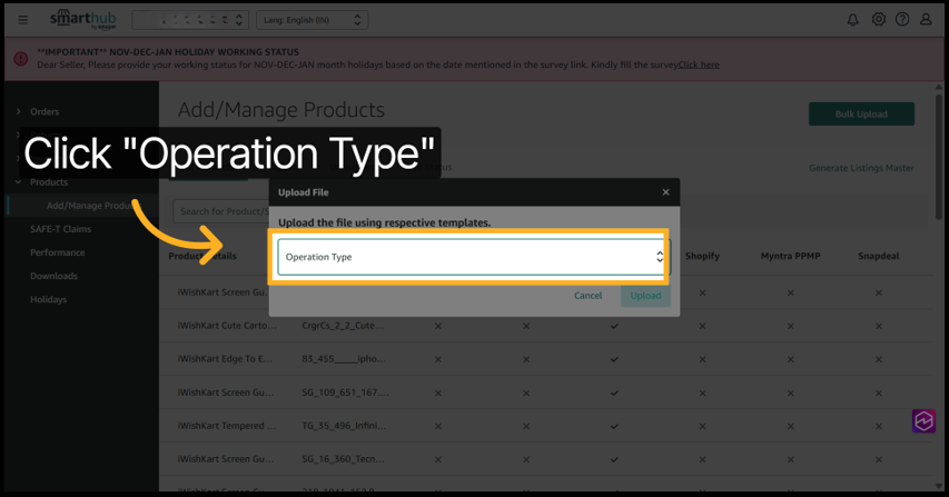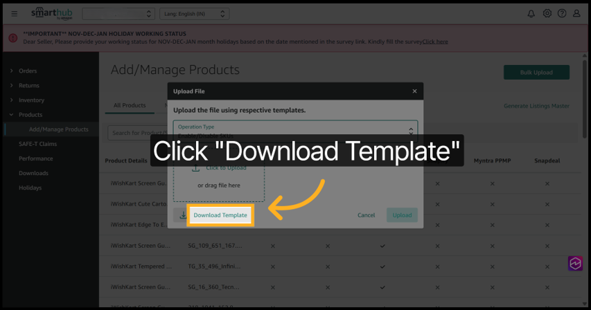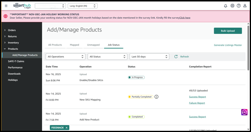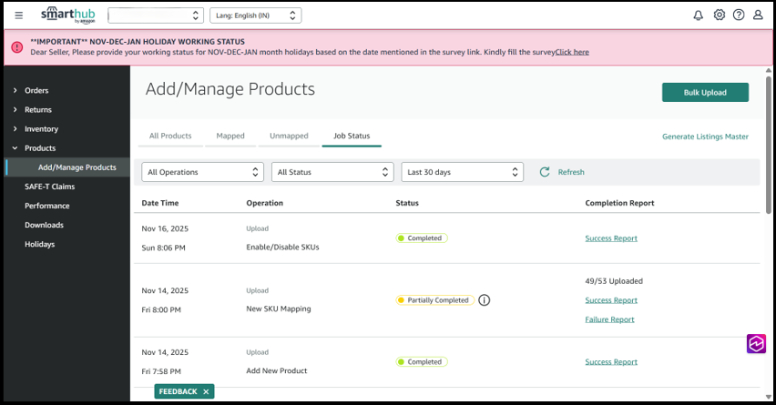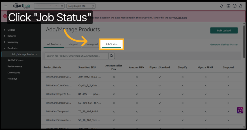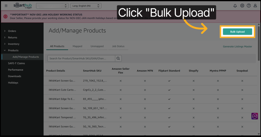 2. Click Bulk Upload from the product management page.