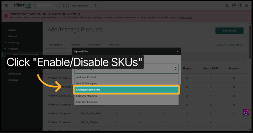 4. Click Enable/Disable SKUs to manage the activation status of your product SKUs.