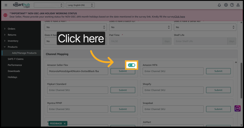 7. Select the desired channel and click the toggle button next to the channel which is in green colour in order to unmap or disable mapping for the product.