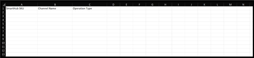 6. The downloaded template looks like the below image. Now fill the SmartHub SKU field and select the Channel Name basis the channel you want to unmap, from the drop down list under Channel Name and select Operation Type as Disable.