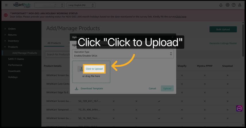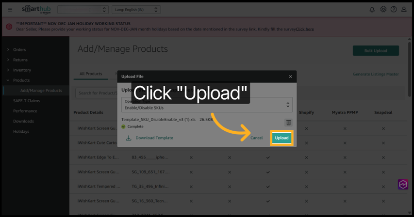 8. Click Upload to submit your bulk SKU enable/disable file for processing.