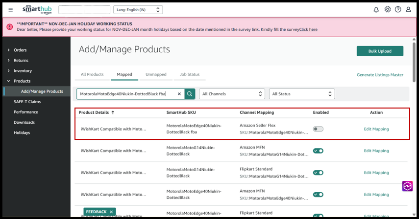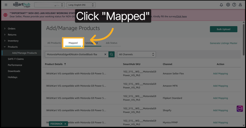 11. To confirm if the mapping was disabled, navigate to Mapped section under Add/Manage Products